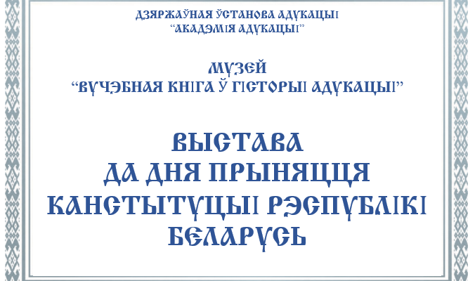 13 марта в Музее «Учебная книга в истории образования» Академии образования была открыта тематическая выставка ко Дню Конституции Республики Беларусь. На выставке представлены наиболее значимые документы (репринты) отражающие историю становления и развития конституционного права на белорусских землях. Статуты Великого Княжества Литовского 1529, 1566 и 1588 годов, будучи крупными сводами законов того времени, содержат нормы конституционного, административного, гражданского, семейного, земельного, уголовного, процессуального права и служат ярким образцом систематизации правовых норм. Конституции 1919, 1927, 1937 и 1978 годов отражают самобытный путь Беларуси в области конституционного и государственного строительства. 15 марта 1994 года Верховным Советом Республики Беларусь была принята первая Конституция в истории суверенной республики. Поздравляем всех граждан Республики Беларусь с Днем Конституции!