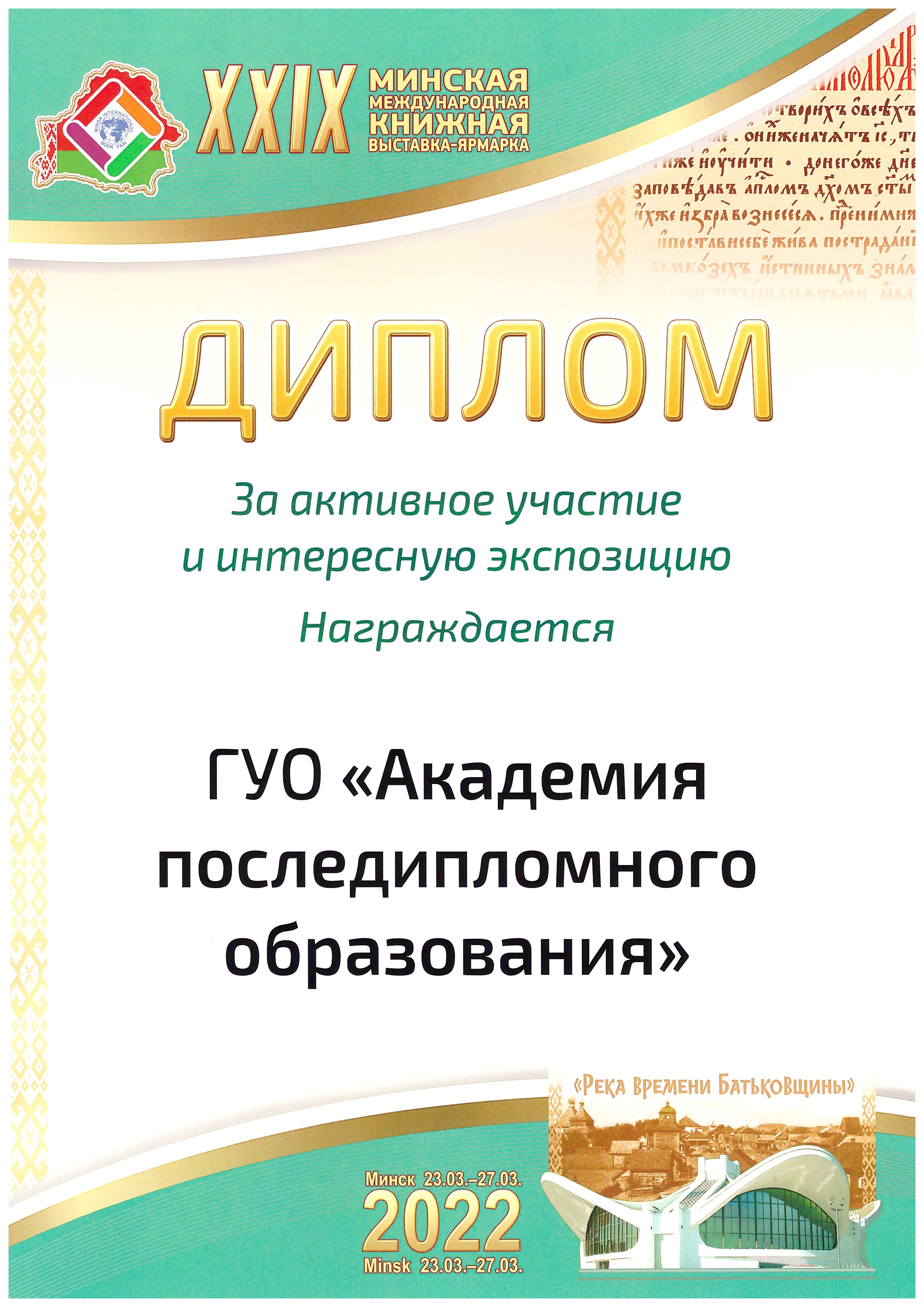 З 23 па 27 сакавіка Дзяржаўная ўстанова адукацыі «Акадэмія паслядыпломнай адукацыі» прыняла ўдзел у найбуйнейшым міжнародным кніжным форуме — ХХІХ Мінскай міжнароднай кніжнай выставе-кірмашы. Акадэміяй былі прадстаўлены фрагменты экспазіцыі музея «Вучэбная кніга ў гісторыі адукацыі», якія выклікалі вялікую цікавасць у наведвальнікаў выставы. Па выніках форуму Акадэмія была ўзнагароджана дыпломам «За актыўны ўдзел і цікавую экспазіцыю».